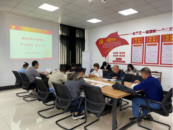 10月12日下午,数理科学与工程学院党委在学院301室召开中心组学习(扩大)会,院党委委员、纪委委员、院领导、各党支部书记参加了会议,会议由院党委书记张清主持。