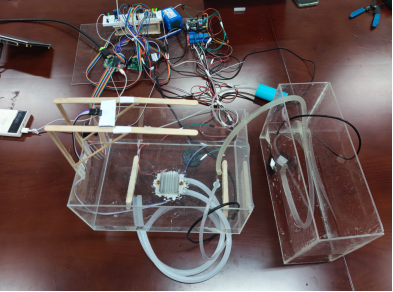 作品介绍:团队基于Robei EDA软件设计开发了这款鱼缸养护机器人。系统控制部分包括Robei八角板和沉芯芯片,通过八角板预处理由传感器采集的数据,根据预设条件的判断,通过沉芯芯片执行各类电机工作,调整水体环境至正常状态。实现鱼缸的自动供氧、调整水位、控制水温、LCD显示数据、摄像头显示等功能。由于该系统具有可重构的特征,可增加数据通信、传感器等功能模块,设计实现水体污染的实时监测系统,将会在环境监测、水体保护等领域有非常广泛的应用前景。(参赛选手:郑力鑫(明191C)、陈雨尘(仪202)、何焕(通c201)指导教师:唐绪兵、武卫华)
