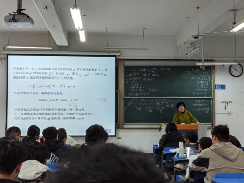 课程由应用数学系谭高山主讲。谭老师授课方式灵活多样:课程引入部分使用了讨论法;主要知识点的教学使用了讲授法和任务驱动法,激发诱导学生找到问题的解决办法;例题部分则使用了体验学习法,让学生在自我思索和练习中领悟知识,理解和掌握知识。授课教师依据题干中所给条件,引导学生选择恰当的方法来求解平面方程,并对学生进行思想教育,每个人的特长不同,应依据自身条件,努力成长为知识面广且学有专长的创新型人才。最后主讲教师归纳总结了平面方程的三类表达式,虽然形式不同,但它们之间可以相互转化。这种形式上的多样性和实质上的统一性,体现了辩证统一的思想,引导学生全方位多角度地看待和分析问题,并将事物之间的联系和区别有机统一起来,从而实现创新发展。课程教学过程中,学科内容和思政元素有机融合,充分体现了教书育人的教学宗旨。