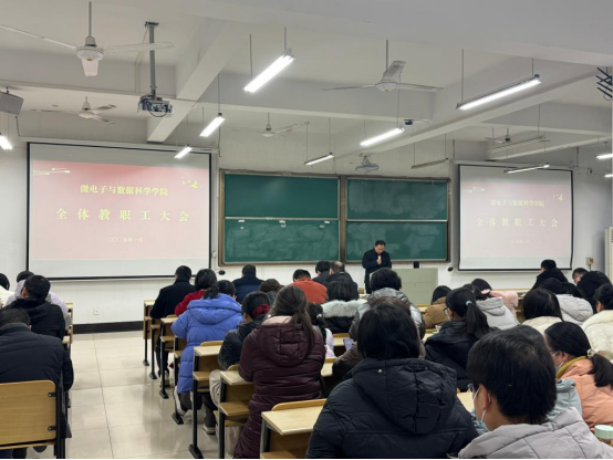全院教职工大会在数理楼403 室召开,学院党委书记汪春胜主持会议,全体教职工参会。