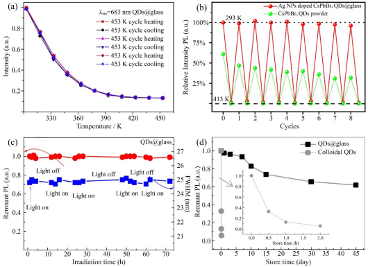 钙钛矿量子点具有带隙可调、高量子效率、超窄半高宽、和超高的发光色纯度等优点,具有广阔的光电应用前景。然而,由于表面存在陷阱缺陷状态以及晶体边界导致稳定性能较差,环境中的水、氧气、紫外线和温度等因素都会使其光电性能大幅度降低。为了改善钙钛矿量子点的稳定性能,通过将钙钛矿量子点原位生长在玻璃基质中,利用无机玻璃致密的网络结构实现对量子点的无缝包覆,将量子点与外界环境隔绝,从而可以有效地解决量子点的稳定性问题,使其表现出优异的光稳定性、耐水性和耐热性。因而在照明与显示、激光与传感器等领域具有更加广阔的应用前景。本文综述了全无机钙钛矿量子点玻璃的制备方法及其优异的发光特性,并对近年来其在各应用领域的进展进行了概述,以期为全无机钙钛矿量子点荧光玻璃的发展应用提供思路和参考。