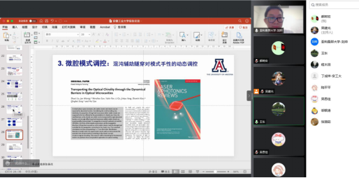 刘帅首先介绍了光学微腔内的光场调控及应用,如非厄米奇异点附近的量子隧穿、光学手性等新奇光学现象,光学传感,方向性激射微腔激光等,随后详细展示了课题组研究的光学微腔内的光场操控技术。光学微腔的性质是由其腔内所激发的光场分布决定,因而对腔内光场进行有效操控是该领域一个重要研究方向。本报告将引入“波导-微腔”直接相连体系作为光学微腔内的新的光场操控手段,重点讨论一种新型光学微腔模式的耦合机制及其在低成本光学传感中的研究,变形光学微腔中混沌辅助隧穿过程及其对模式手性的调控研究,光学微腔中模式分布的快速成像机制等。