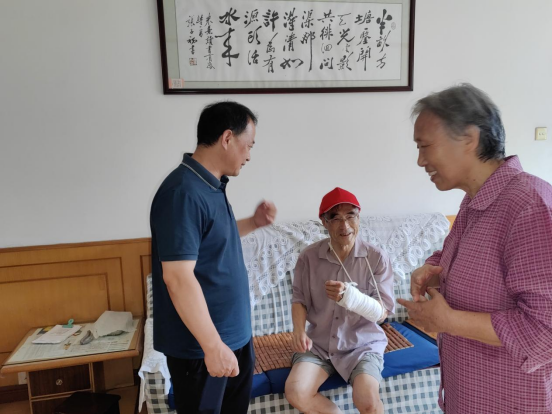 在陈老师家,汪春胜与陈老师亲切交谈,详细了解他的病情和生活状况。嘱咐他安心养病,有困难及时跟学院说,组织上会积极帮助。工会主席朱红宝也转达全院职工对陈老师的关心,期盼他早日康复。陈德祥老同志感动地说:“想不到啊,退休19年了,组织上还记得我,还如此关爱我,让我感受到学院大家庭的温暖,让我好感动!”