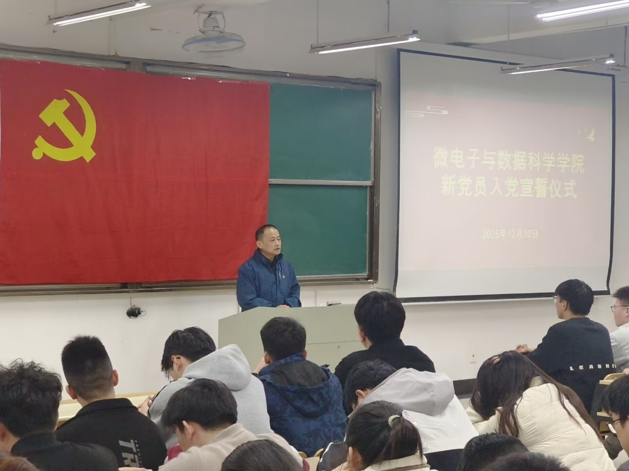 仪式在气势磅礴的《国际歌》中拉开帷幕。段世祥宣读了学院党委关于党员发展和转正的批复。随后,汪春胜及各学生支部书记为新发展的预备党员佩戴党员徽章。全体新党员和老党员面向党旗庄严宣誓,誓言铿锵有力,表达了党员们对党的忠诚和为人民服务的决心。大数据本科生党支部陈璇作为新党员代表发言,郑重承诺用实际行动践行初心使命。微电子本科生党支部刘文杰作为老党员代表发言,对新党员予以祝贺,结合自身经历分享了入党后的成长感悟。
