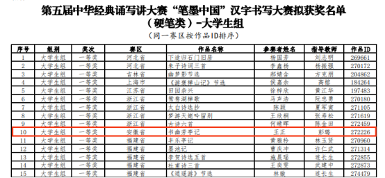 中华经典诵写讲大赛由教育部、国家语委主办,大赛以“书香新时代,‘典’亮新征程”为主题,通过诵读、书写、篆刻等语言文字表现形式,诠释中华优秀传统文化内涵、彰显中华语言文化魅力、弘扬中国精神。第五届中华经典诵写讲大赛“笔墨中国”汉字书写大赛已完成全部赛程,共评选出大学生组硬笔书法一等奖作品32幅,其中安徽赛区仅有王正同学获一等奖。下一步,学院将进一步学习贯彻习近平文化思想,引导师生继承和弘扬中华优秀传统文化,厚植爱国主义精神,坚定文化自信自强。(撰稿:张佳良 审核:陈恳 张敏)