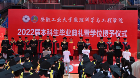 毕业典礼在庄严的国歌声中拉开帷幕。典礼上,学院院长黄仙山宣读了数理科学与工程学院2022年安徽省普通高校品学兼优毕业生名单、2022年校优秀毕业生名单、2022届毕业生校友联络员名单。参加典礼的各位领导分别为优秀毕业生颁发荣誉证书,为校友联络员颁发聘书。