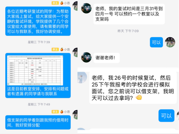 “老师,我刚收到国防科大的复试通知,我们宿舍有2名同学复试时间相同,复试场地能不能帮我们解决一下”一名学生向辅导员发信息求助。