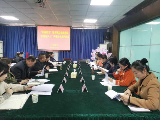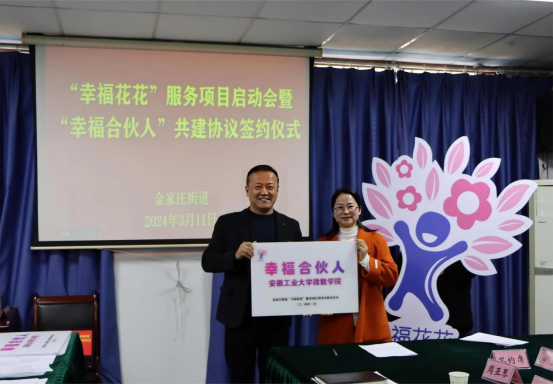 3月11日,花山区金家庄街道举行“幸福花花”服务项目启动仪式,共青团花山区委、微数学院、花山区妇联、花山区人民检察院等首批“幸福合伙人”单位代表参与了启动仪式,就共建工作进行了深入交流,并现场签署共建协议。签约仪式上,学院研究生党支部支部书记宋二银老师就共建工作进行了深入交流。